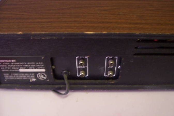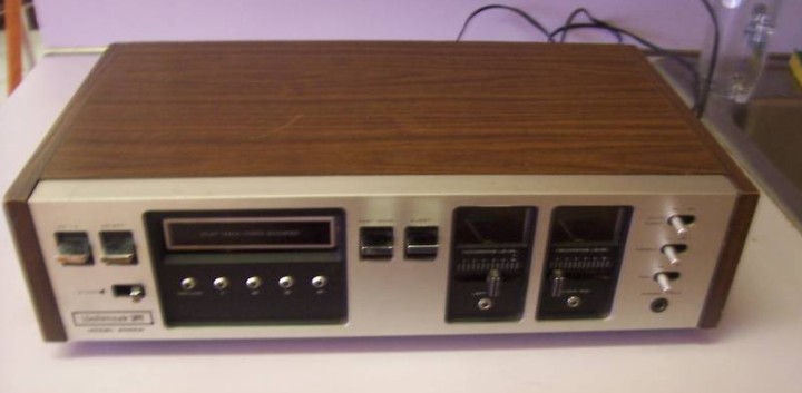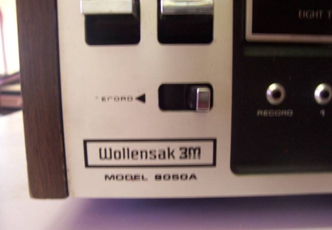 Wollensak 8-Track recorder model 3M 8050A. From the summer of 1972. Features, pause, fast wind, eject power - on - auto/off, track - all/one, arl - on/off, both right/left mic inputs, stereo phones output for headphones, both right/left recording level sliders, both right/left VU meters. Replaced the "power" and "track" switches with "auto-eject" and "repeat" switches that enabled eject after one track or all four. Neat 8 Track recorder!